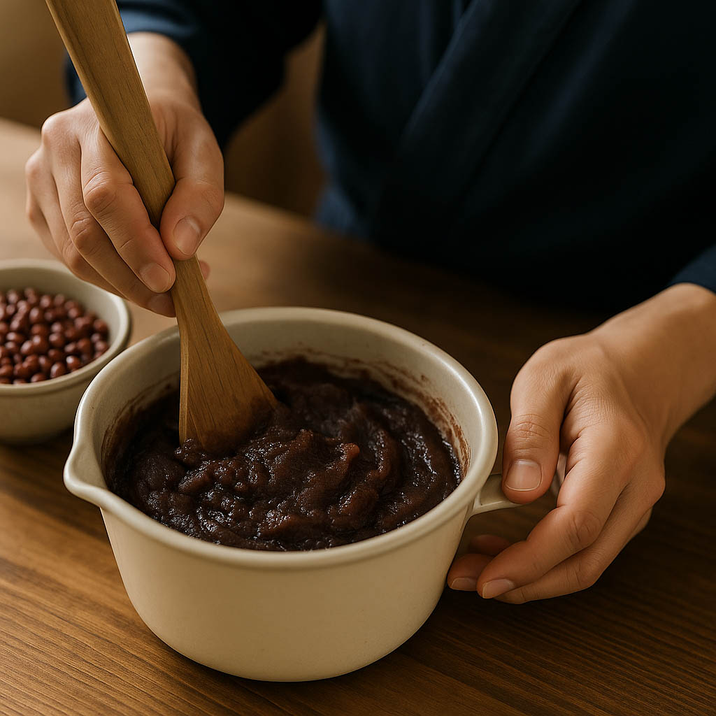 毎朝、小豆を丁寧に炊き、職人の手で練り上げる餡。 作り置きはせず、その日の分だけを仕込み、 できたての風味と滑らかさを守ります。